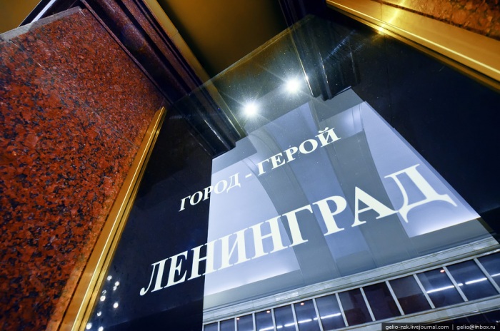 47. Колонны и стены станции облицованы мраморными и гранитными плитами. Спаренные колонны образуют как бы Триумфальную арку. Каждая из арок посвящена одному из городов-героев, название которого написано на стекле, находящимся между спаренными колоннами.
