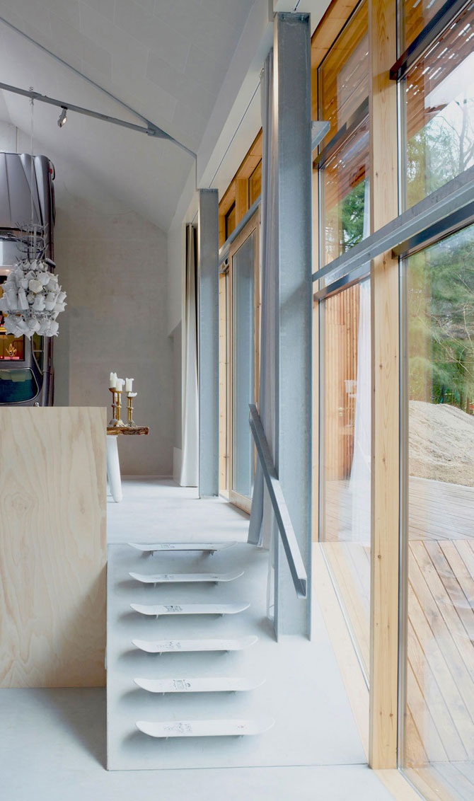 Внутри можно наблюдать открытое пространство, в котором хаотично разбросаны комнаты в виде деревянных конструкций. Владельцы резиденции, молодая семья, может варьировать количество комнат, добавляя или убирая их по мере необходимости, скажем, с рождением и ростом детей. Данный особняк настолько непредсказуем, насколько и самодостаточен, учитывая все «зеленые» технологии, успешно примененные в нем.
