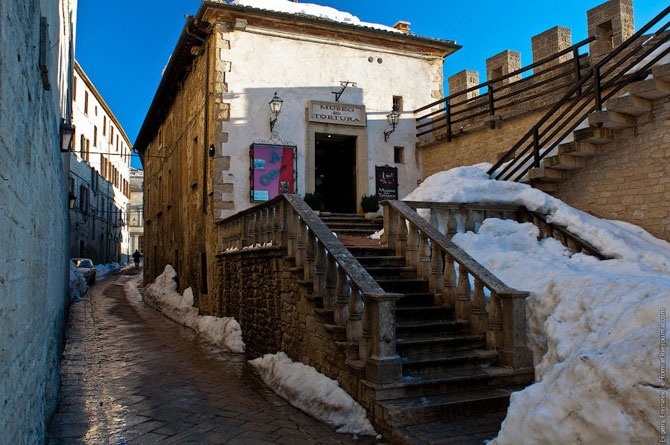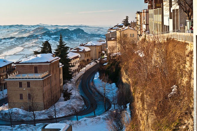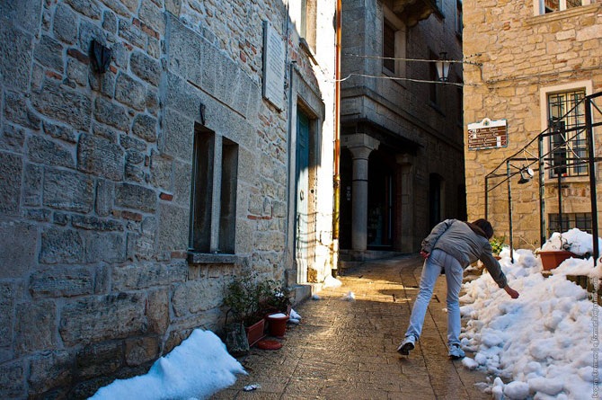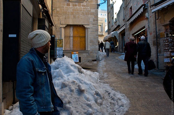 Снег в Сан-Марино — это достаточно редкое явление, и обычно он особо-то не задерживается. Но за 2 недели до нашего приезда его выпало предостаточно: во время нашего пребывания в теневых участках попадались метровые сугробы: