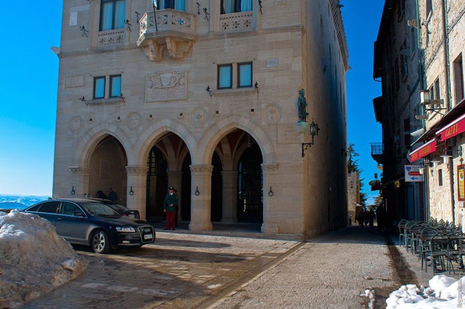 Площадь территории государства составляет всего 60.57 кв. км. Страна располагается на высоте 738 м над уровнем моря на юго-западном склоне горного массива Монте-Титано. На фотографии: правительственный дворец: