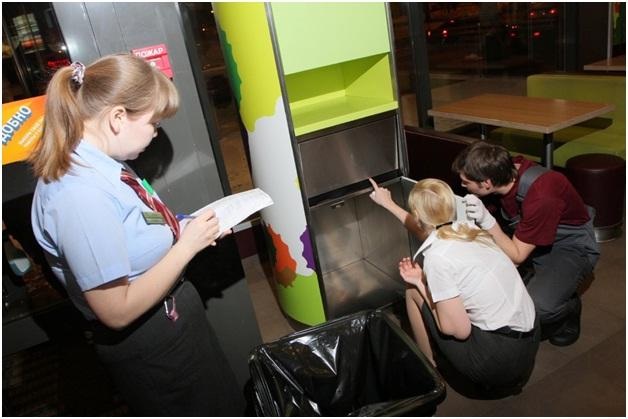 Ночному менеджеру тоже придется потрудиться — заменить стершуюся наклейку для маффинов, (ох, когда же я доберусь до своего хашбрауна!), поправить игрушки Хеппи Мил, убрать лишнее из стаканов в диспенсерах, поправить пакеты над бином (у нас так называется место для хранения готовых сандвичей).