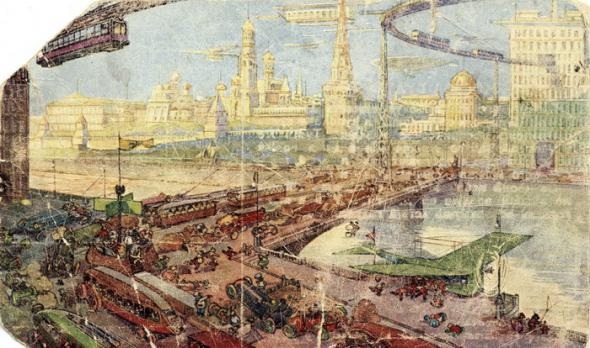 В далеком 1914 году российская шоколадная фирма «Товарищество Эйнемъ» (известная сейчас как фабрика «Красный Октябрь») выпустила шоколадные конфеты под названием «Москва будущего». В каждую коробку с конфетами упаковывалась и серия из 8 рекламных открыток такой же тематики.