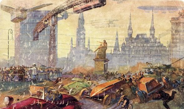 3. Красная площадь. Шум крыльев, звон трамваев, рожки велосипедов, сирены автомобилей, треск моторов, крики публики. Минин и Пожарский. Тени дирижаблей. В центре — полицейский с саблей. Робкие пешеходы спасаются на Лобном месте. Так будет лет через 200.