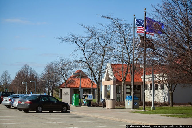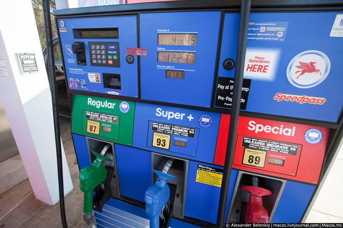 Заправки – это тоже шедевр звериного оскала капитализма. Чтобы просто залить бензин, не нужно идти к кассе, всё оплачивается здесь же, возле машины, через терминал, который конечно же, принимает банковские карты. Два типа топлива, как и у нас: бензин и дизель. Октановое число у американского бензина совсем не такое, как у нас: 87, 89 и 93. Но здесь смело можно покупать самый дешёвый, что я и делал.