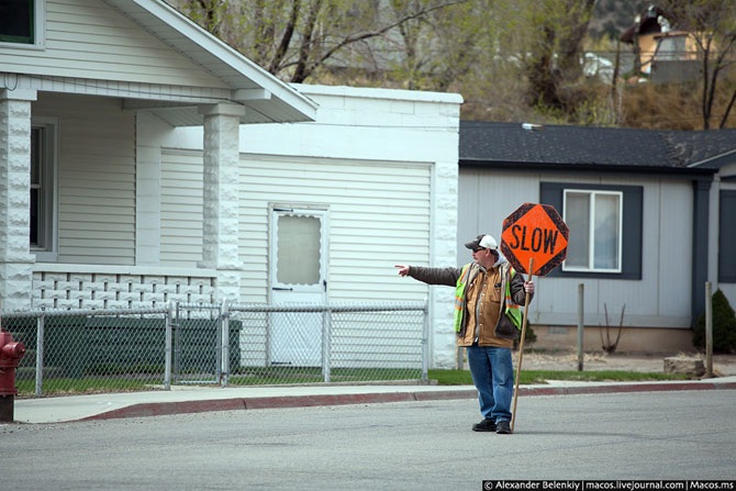 А во время проведения локального ремонта в маленьких городках на перекрытых дорогах стоят вот такие дядьки (иногда тётьки) и держат в руках знаки.