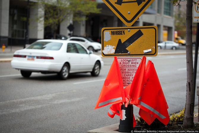 Такие флажки я встретил в городе Солт-Лейк-Сити на нерегулируемых светофорами переходах. Это очень удобно, как мне кажется.