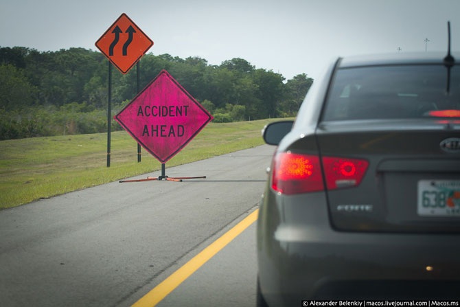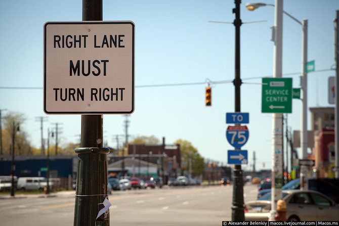 Сами же правила дорожного движения здесь настолько простые, что они понятны и ребёнку. Дорожных знаков в привычном нам понимании в Америке нет: наверное, есть всего десяток пиктограмм, как правило, обозначающих направление движения. Большинство знаков – это обычные белые таблички с чёрными буквами, объясняющими, что здесь можно делать или что нельзя. �Машины в правой полосы должны повернуть направо� – это же гениально. Английский язык очень простой и лаконичный, все знаки читаются на любой скорости.