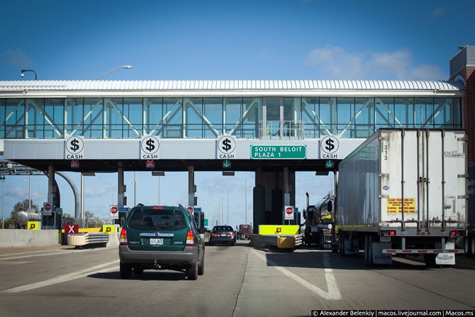 Платные дороги встречаются больше на востоке страны. Удивительная особенность американской платной дороги: можно заплатить только наличными. Никаких банковских карт. Это очень странно для такой повсеместно использующей пластик страны. Есть ещё вариант безнала, но это только для постоянных клиентов: покупается коробочка, которая по радиосигналу передаёт информацию о машине, а в конце месяца выставляется счёт. Но такие устройства уникальны для каждого оператора дороги, а компаний там очень много.