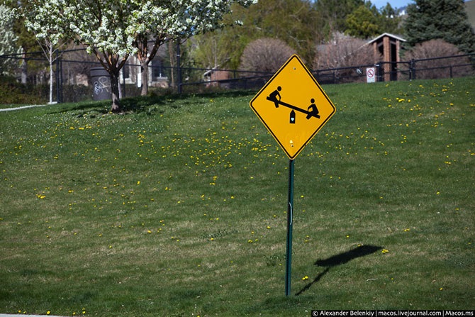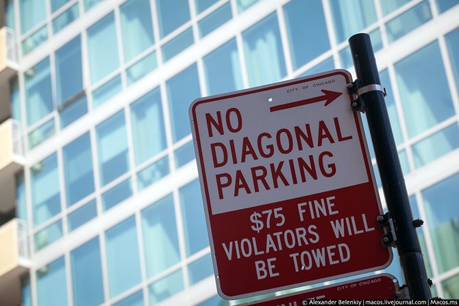 Там, где парковка не запрещена – она разрешена. Но конечно, нельзя ставить машину на перекрёстке, на тротуаре даже одним колесом, нельзя мешать своим автомобилем другим участникам движения. А ещё посмотрите на то, как сделаны американские знаки. Они держатся на болтах, и если нужно повесить другой знак или поместить временнный, он просто прикручивается к тому же столбу чуть ниже.