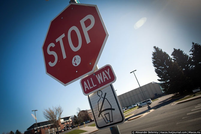 Знак �СТОП� одинаковый во всём мире. Его встречают на нерегулируемых перекрёстках, и обычно снабжают дополнительной небольшой табличкой снизу, где написано �All way� или �4-way�. Это обозначает, что вы должны остановиться перед выездом на перекрёсток, а если там уже стоят другие машины, приоритет у того, кто приехал раньше. Это работает идеально, потому что водители, как правило, вежливые и дисциплинированные. Нет, не у кого машина круче, а действительно – кто первый приехал на перекрёсток со знаком �СТОП�, тот первый с него и уедет