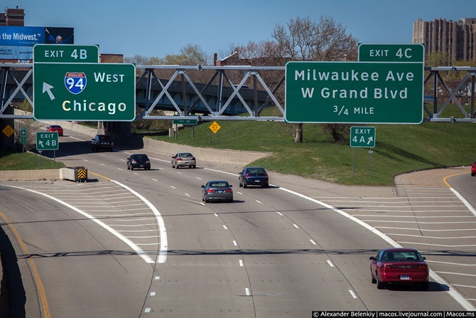 Развязки-�бабочки�, которые продолжают строить с непонятным мне упорством, в США не строят уже лет тридцать, они совершенно неэффективны, машины только мешают друг другу. Да, здесь тоже почти все съезды с трассы – из правого ряда. Но вот дальше – по-другому.