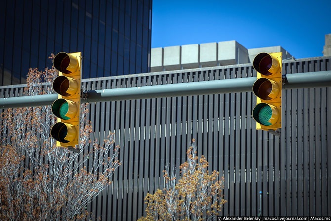Жёлтые светофоры – отличительная особенность штата Мичиган. А в Луизиане они, например, зелёные. Не стоит пугаться, если перед вами светофор не с тремя, а с четырьмя, пятью и более секциями. В �лишних� окошках всего лишь прячутся стрелки поворота. У нас делают выносные секции, у них всё в одном светофоре.