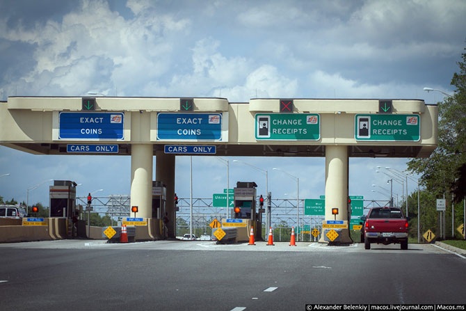В Флориде же идиотизм платных дорог достигает апогея. На небольших выездах с автобана можно заплатить либо через эту самую радиоточку FasTrack, либо кинуть в специальный ящик монеты, ровно столько, сколько нужно. Сделали это, чтобы не нанимать тётушку-негритянку, поскольку поток машин на этих съездах невелик.