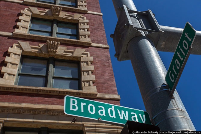 Начнём в городах. Здешняя уличная навигация – отличный пример того, как можно ездить по незнакомому городу и не заблудиться. Когда американцы объясняют дорогу, они не рисуют планы карандашом на коленке, им достаточно просто перечислить нужные улицы. Дело в том, что на каждом перекрёстке с двух сторон будут такие таблички, указывающие улицу, по которой вы едете, и пересекающую её. К тому же, очень легко назначать встречи: на углу Бродвея и Гратьот-стрит. Что может быть проще?