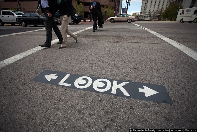 Напоминание, куда смотреть при переходе дороги.