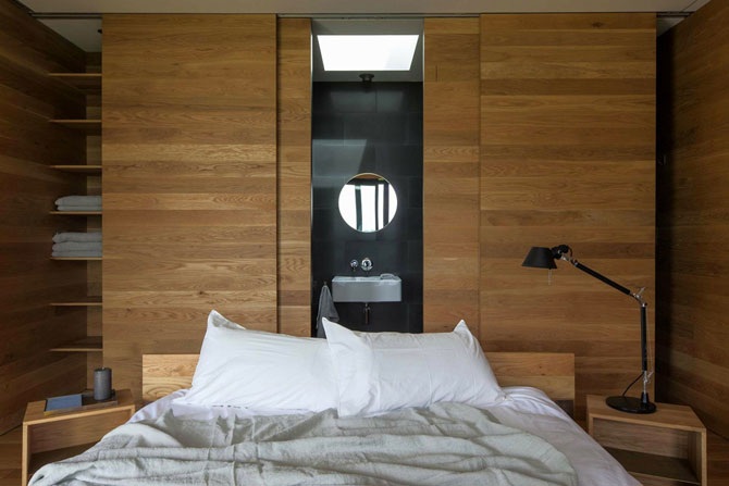 Его внешняя отделка выполнена из грубой черной древесины. Внутри резиденции стены и полы облицованы дубовыми досками, которые выглядят одновременно грубо и тепло. Коттедж построен вдали от инфраструктуры, поэтому энергия аккумулируется солнечными батареями, а независимая система сбора и очистки воды обеспечивает комфортное проживание в доме.