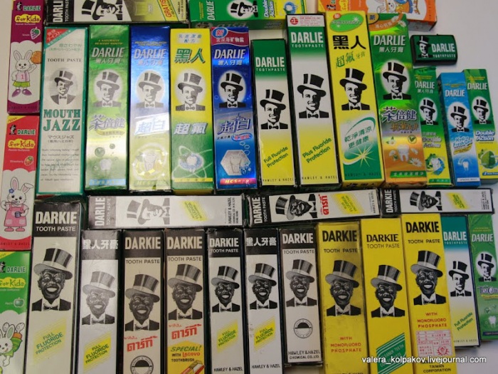 Белые зубы у негров — символ зубного здоровья. Таиландская паста «Darkie» (в переводе — темный) в нижнем ряду, после политически корректной трамсформации становится «Darlie» (в переводе — дорогуша) в верхнем ряду.
