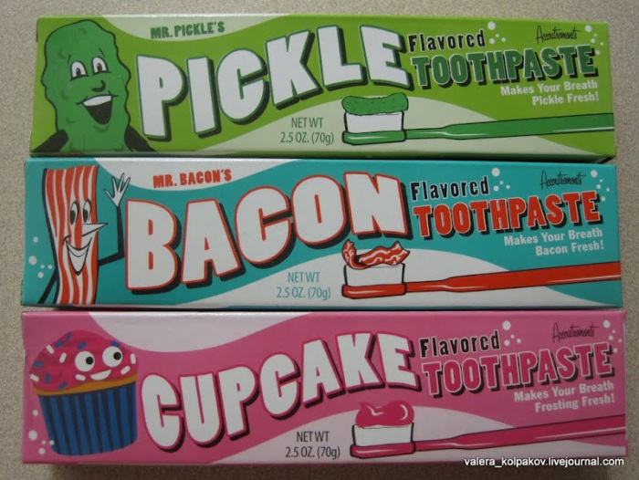 Зубные пасты со вкусом огурца, бекона, кекса.