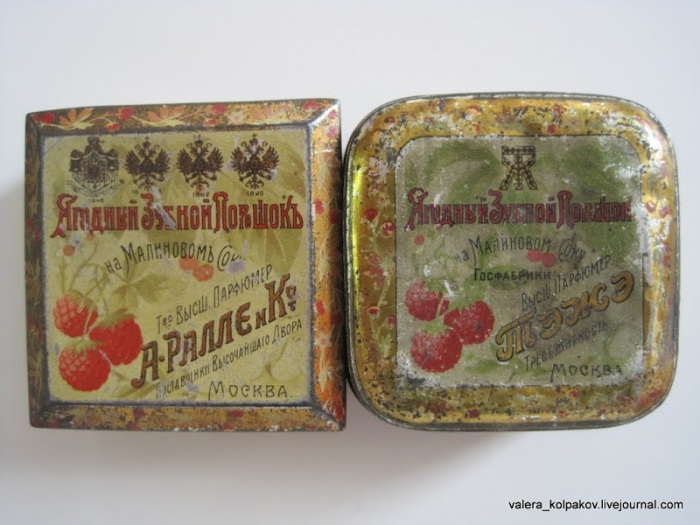 Ягодный зубной порошок на малиновом соку. Слева — дореволюционный, поставщиков Высочайшего двора, Ралле и Компания, а справа — послереволюционный — Треста «Жиркость», будущая фабрика «Свобода».