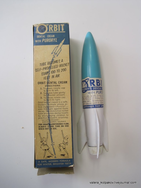 Зубная паста с тюбиком в виде ракеты из космических 1960-х. Когда паста заканчивается, в тюбик загружается ракетное топливо и ракета готова к запуску.