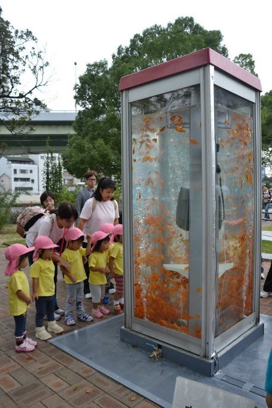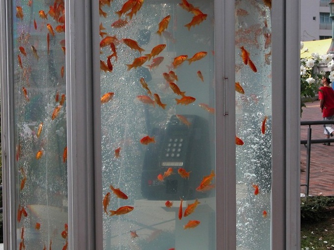 Эпоха мобильных телефонов больше нуждается в прекрасном, чем в архаизмах прошлого века — телефонных будках. Японская арт-группа Kingyobu нашла достойное применение общественным таксофонам на улицах Токио. Художественный коллектив превратил унылые телефоны-автоматы в аквариумы, которые заполнили изящными золотыми рыбками.