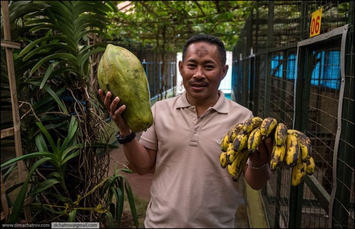 Не думайте, что лувак ест только кофейное зерно. Кофе для него — лакомство. Обычный рацион составляют папайя и бананы в больших количествах, а кофе — только десерт. Взрослый лувак в день может слувачить схомячить не больше полкило ягод. Клетки за спиной работника — жилища луваков, содержащихся на плантации.