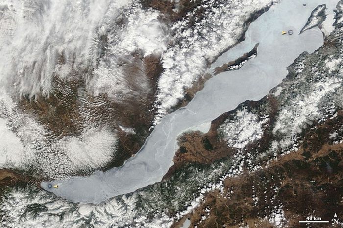 Озеро Байкал в южной Сибири уникально по многим аспектам. Оно самое древнее, глубокое и большое пресноводное озеро на Земле. Наибольшая глубина озера составляет 1642 метра, а многие виды рыб, которые в нем обитают, нельзя больше встретить нигде на планете. Так как в июне лед с Байкала обычно полностью спадает, астронавты с Международной Космической Станции были удивлены, когда обнаружили большие кольца льда у южных берегов Байкала в апреле 2009 года. Происхождение этих колец остается загадкой, но есть предположение, что они возникают благодаря подъему глубинных вод и повышению температуры поверхностного слоя воды в центральной части кольцевой структур, но подобные явления ранее тут никогда не замечались.