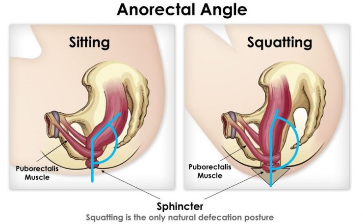 Оказывается, человек сделан таким образом, что для справления большой нужды он должен приседать попой до земли. Так что обычное сидение на унитазе, как на картинке слева (серый человечек) — нефизиологично. Нужно сидеть как на картинке справа (оранжевый человечек) — с поднятыми ногами. Этому даётся научное объяснение. Дело в том, что прямую кишку петлёй охватывает лобково-прямокишечная мыщца. Если ноги недостаточно подняты, то мыщца сжимает прямую кишку, затрудняя опорожнение.
