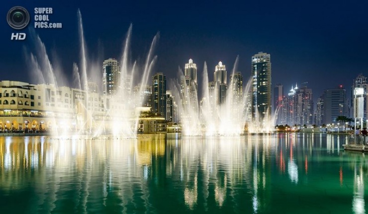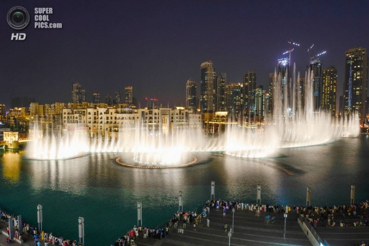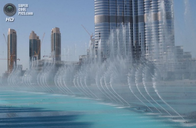 Самый большой музыкальный фонтан в мире находится в искусственном озере у небоскреба «Бурдж-Халифа», Дубай. Длина фонтана составляет 275 метров, высота выброса воды — 150 метров. Струи воды подсвечиваются 25 цветными и 6 600 точечными прожекторами. Грандиозное шоу проходит ежедневно каждые 30 минут с 18:00 до 22:00 по будням и с 18:00 до 23:00 по выходным. На строительство фонтана было потрачено $218 млн.