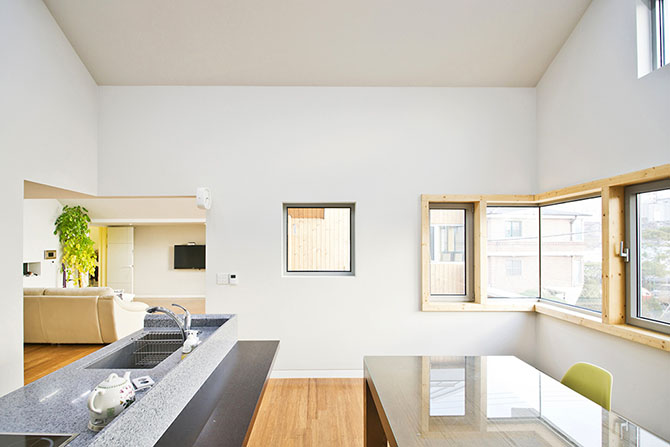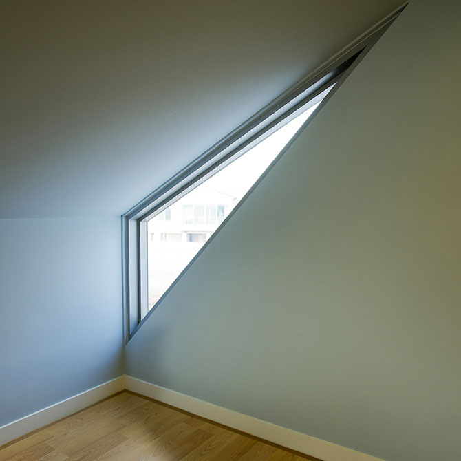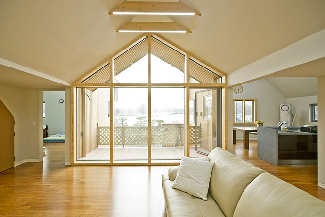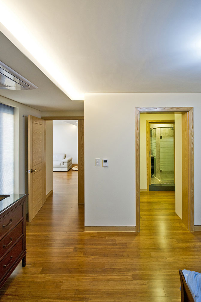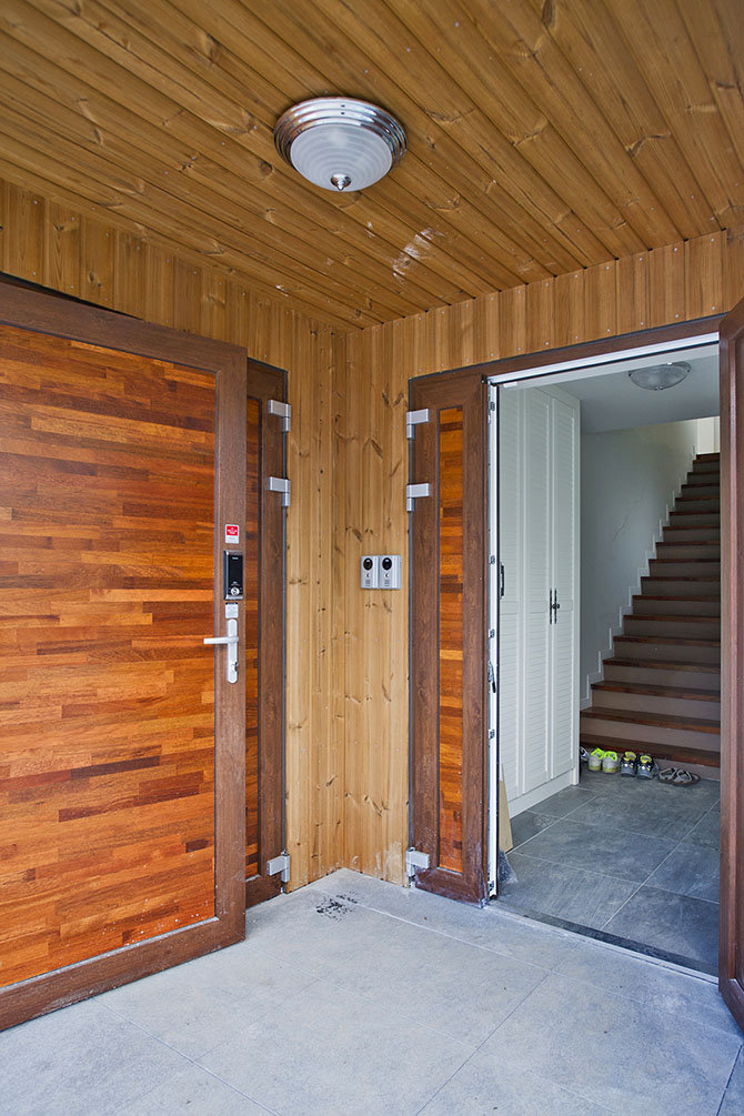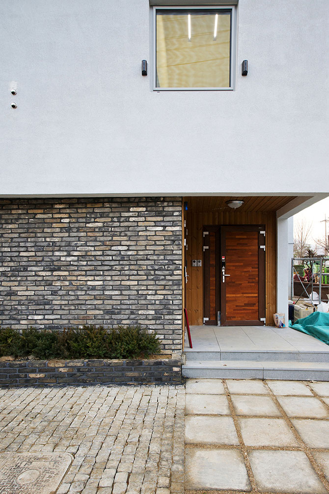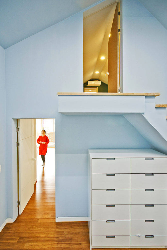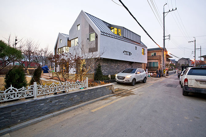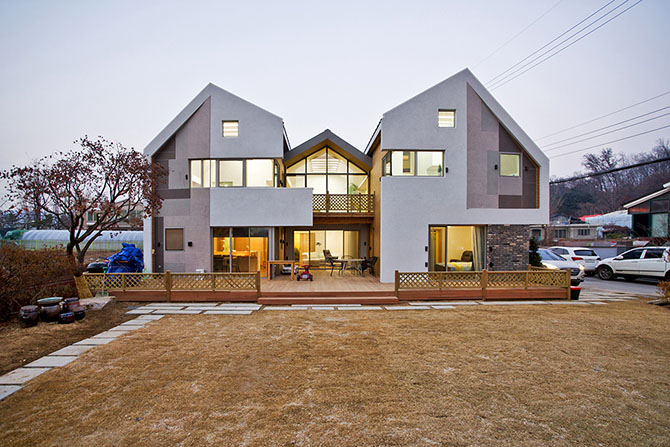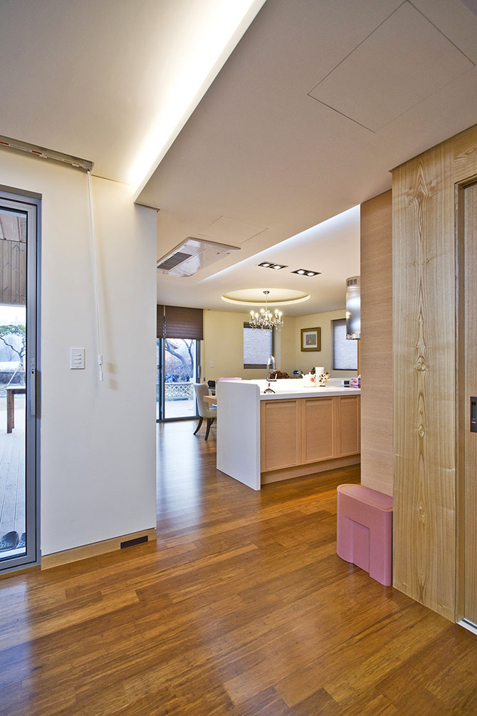 Тем не менее, первоначальное решение поделить особняк вертикально на три дома было отвергнуто в пользу большей функциональности горизонтального планирования. Старшие члены семьи живут на нижнем уровне в виду состояния физического здоровья, а молодое поколение занимает два верхних этажа.
