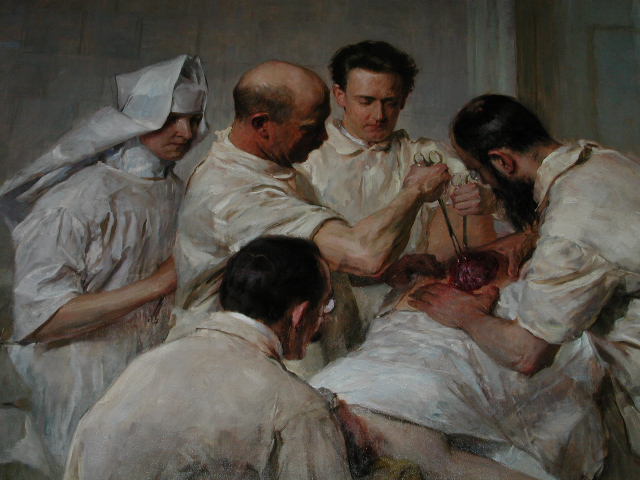 Хороший врач отличался от плохого быстротой оперирования. Н.И.Пирогов производил ампутацию бедра за 3 минуты, мастэктомию – за 1,5 минуты. Хирург Ларрей в ночь после Бородинского сражения произвел 200 ампутаций (руки он, конечно, между операциями не мыл, это тогда не было принято). Терпеть интенсивную боль дольше 5 минут невозможно, поэтому сложных и длительных операций производить было нельзя.