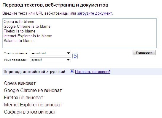 Интернет-пользователи нашли курьезный сбой в одном из сервисов портала Google. Как выяснилось, если в переводчик вставить фразу на английском USA is to blame или Obama is to blame («США виноваты», «Обама виноват»), результат на русском языке появлялся противоположный: «США не виноваты, Обама не виноват».