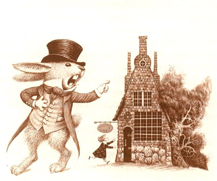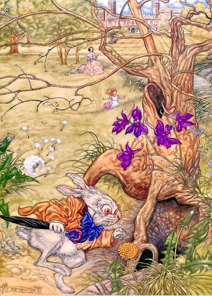 Поначалу Алисе не кажется это особенно странным и только когда кролик вынимает часы из жилетного кармана и, посмотрев на них, убегает дальше, Алиса в изумлении вскакивает на ноги и бежит за ним, ныряя в кроличью нору, с которой и начинается погружение Алисы в удивительный мир Страны Чудес.