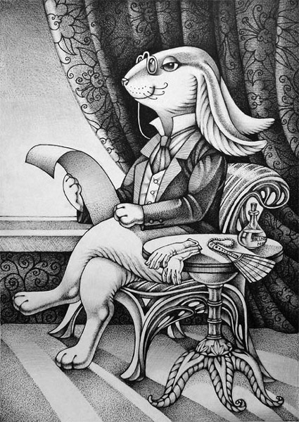 Он появляется в самом начале книги, в первой главе, одетым в жилет и бормочущим себе под нос «Ах, боже мой, боже мой! Как я опаздываю».