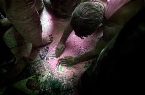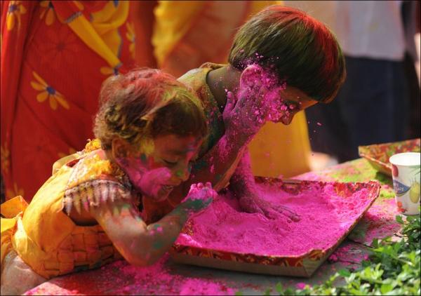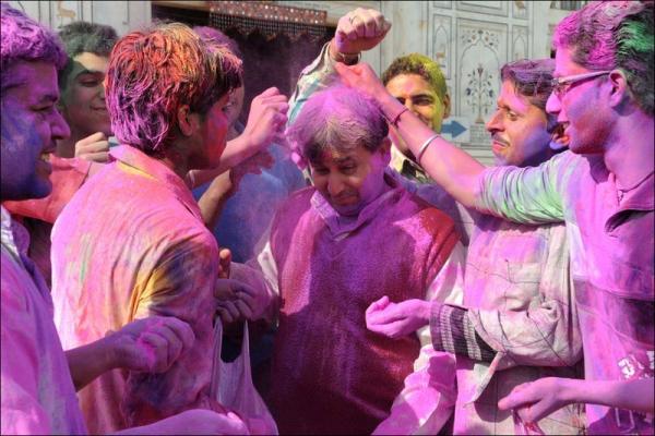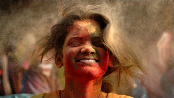17. Во второй день представители всех каст и сословий, мужчины и женщины, старики и дети посыпают друг друга цветным порошком и обливают друг друга подкрашенной водой. (AFP / Getty Images / Deshakalyan Chowdhury)