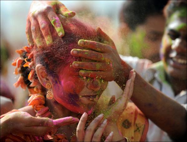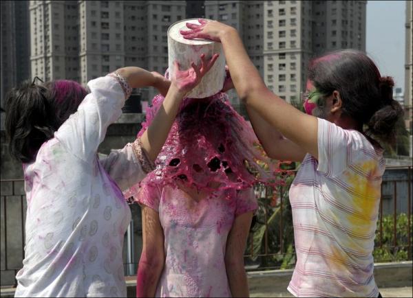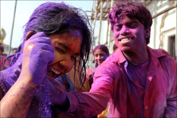 10. Юноша выманивает девушку, отвлекает ее, она засматривается на что-нибудь, а он в этот момент перемазывает ее цветной пудрой или обливает подкрашенной водой. (AP / Manish Swarup)
