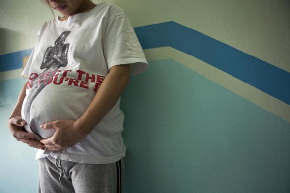 29-летняя женщина на девятом месяце беременности, стоит в «Дури Хоум» — центре, управляемом Армией Спасения в Сеуле. Многие незамужние женщины в Южной Корее предпочитают делать аборты. Те, у кого уже слишком большой срок (почти две трети от общего числа беременных), решают отдать детей на усыновление. (Jean Chung/The International Herald Tribune)