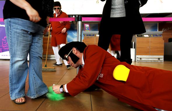 Артист труппы «Mischief La-Bas» в костюме Элвиса Пресли чистит сандалии женщины в аэропорту Прествик (Шотландия). 3 марта 1960 года Элвис Пресли прилетал для дозаправки на тогдашнюю базу США в Прествике после двухлетней службы в армии. (Jeff J. Mitchell/Getty Images)