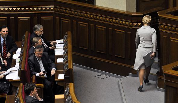 Украинский премьер-министр Юлия Тимошенко покидает здание парламента в Киеве. В среду Верховная Рада Украины отправила правительство во главе с премьер-министром Юлией Тимошенко в отставку. До утверждения нового состава кабинета министров нынешние члены правительства будут работать в статусе исполняющих обязанности. (Sergei Chuzavkov/Associated Press)