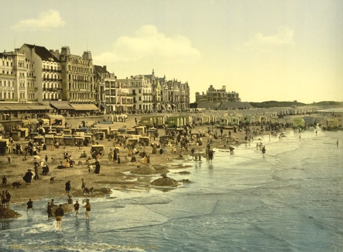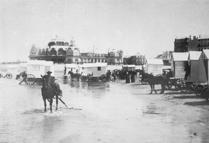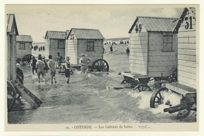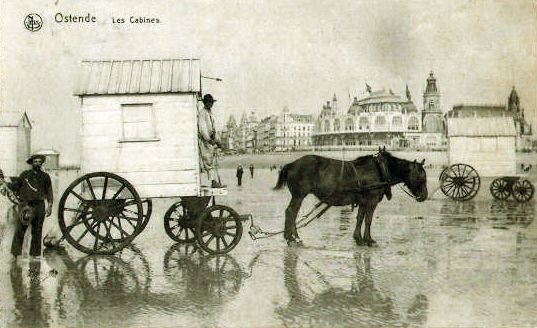 Oostende, the beach and the Kursaal, circa 1890. This gives us a good view of the infamous «Bathing Machines» in which women had to not only change into their bathing suits but also be carried into the water to avoid the indignity of having to walk across the beach in their bathing suits.