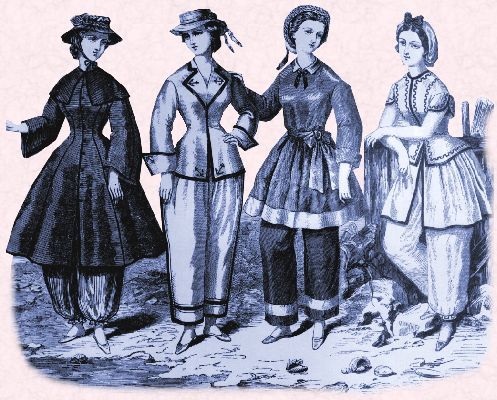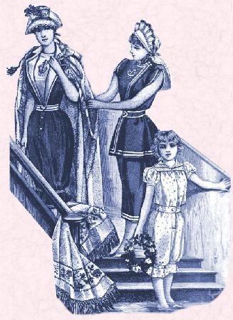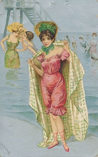 In the early Victorian era women had worn serge or dark flannel bathing dresses, but by the 1860s two piece belted costumes replaced the earlier styles.