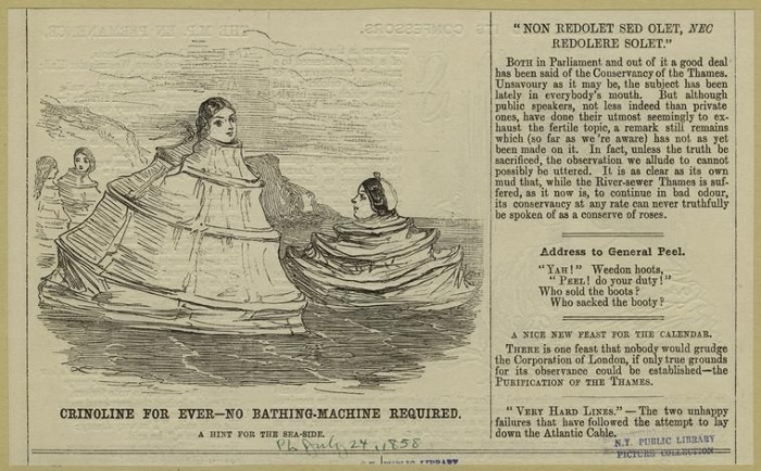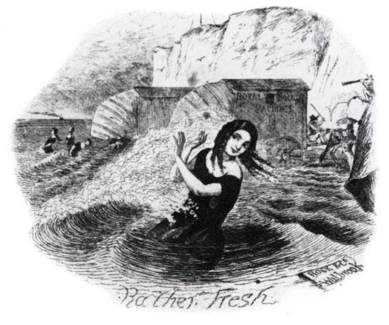 «Rather Fresh», a print produced by Rock & Co. of London, showing young ladies bathing at Brighton in the 1850s.
