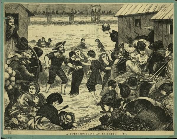 A Swimming-class at Brighton, 1871.” Below, a photograph of women welcoming a newcomer into the water in Brighton