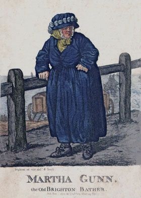 Martha Gunn, «The Venerable Priestess of the Bath», Brighton's leading «bathing woman» and a well-known seaside character, pictured on Brighton beach in a late 18th Century print. In the background, a bathing machine is being pulled into the sea by a horse.