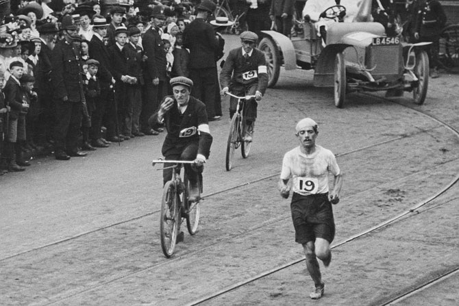 Известный кадр финиша итальянского легкоатлета — марафонца Дорандо Пьетри. Когда маршрут вышел на стадион, где присутствовало 75 000 зрителей, Пьетри настолько устал, что потерял ориентацию и свернул не в ту сторону. Судьи подсказали ему, что он бежит в неверном направлении. Силы настолько оставили его, что на протяжении последних 200 метров дистанции он упал 5 раза, каждый раз поднимаясь с помощью судей. Однако он пересек финишную черту первым, хотя при поддержке со стороны судьи.
