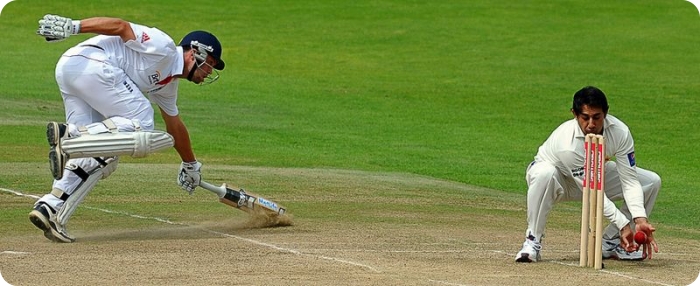 Игрок сборной Англии Джонатан Тротт (слева) защищает границу своих ворот, в то время как пакистанец Саид Аджмаль пытается провести атаку в матче по крикету, прошедшему 9 августа в Бирмингеме. (PAUL ELLIS/AFP/Getty Images)
