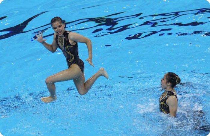 28. Выступление испанской сборной – сплетение ног и красок на фоне голубой воды. (AP Photo/Ng Han Guan)