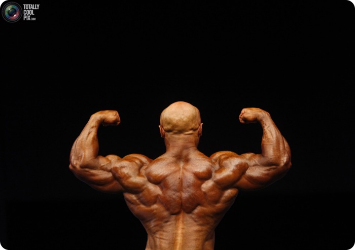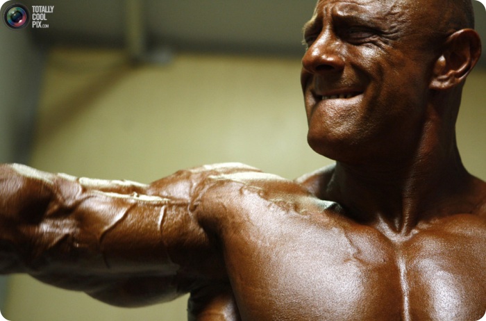 21. Разминка для профессионального бодибилдера так же важна, как и для любого другого спортсмена. Попытка принять необходимую позу без разминки при такой гигантской мускулатуре может закончиться серьезной травмой, так как напряженные стальные мускулы действуют вроде ножниц, и могут повредить нервы.