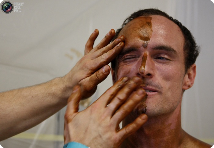16. Процесс нанесения тонального крема на кожу. Этитм кремом покрывается все тело спортсмена.