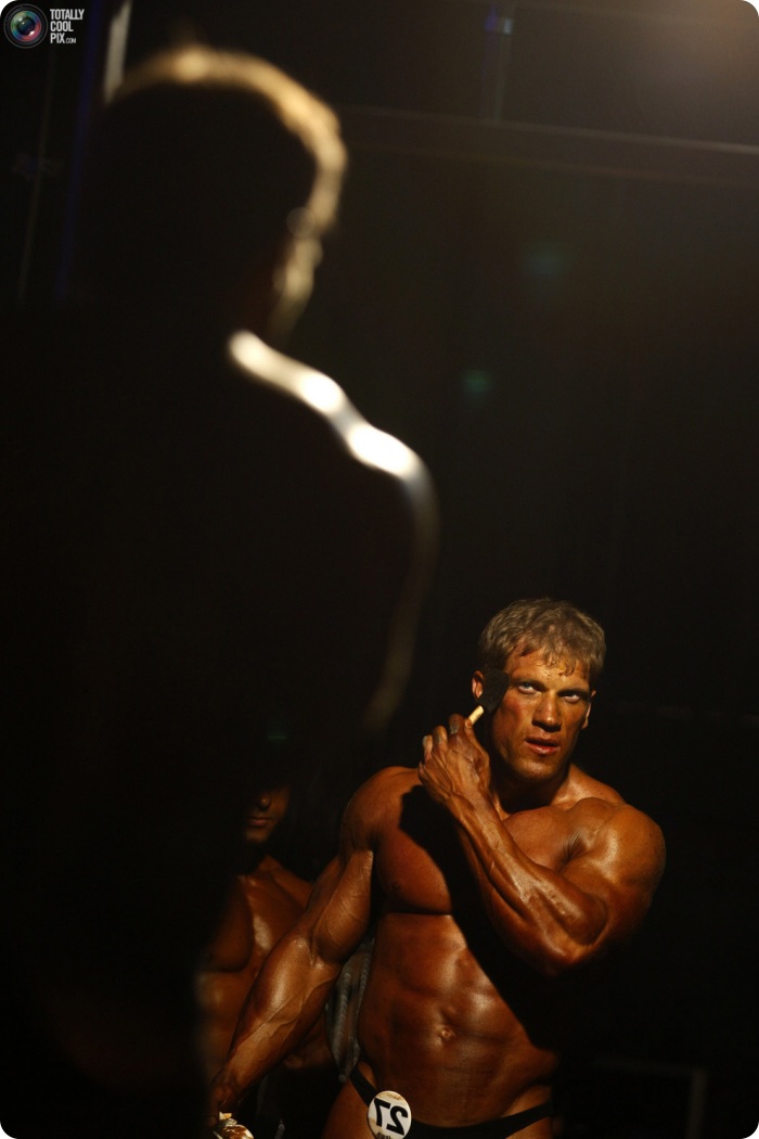 2. Спортсмен готовится к выходу на сцену во время Европейского чемпионата по мужскому бодибилдингу, классическому бодибилдингу и культуризму в Софии 22 мая 2011 года. Чтобы мускулатура лучше смотрелась со сцены, тела участников соревнования покрывают специальным тональным кремом.